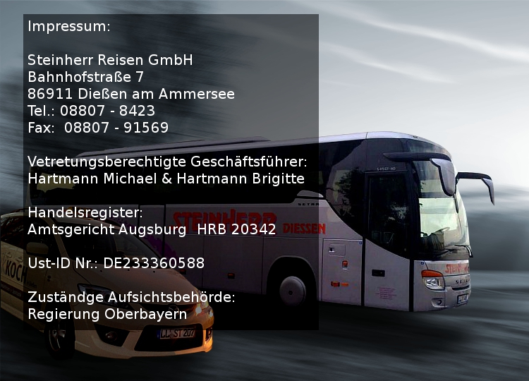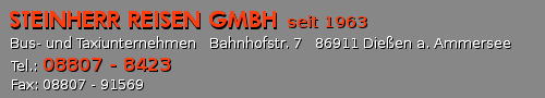 Steinherr Reisen GmbH. Busunternehmen in 86911 Dießen am Ammersee. Wir bringen sie in unseren modernen Bussen sicher und komfortabel zu ihren Traumzielen in Europa. Unsere Busse sind mit Bord-WC ausgestattet. Jeder Bus ist vollklimatisiert. Jeder Bus kann Reisegruppen bis zu 50 Personen aufnehmen. Wir bieten mit unseren Bussen Tagesausflüge, Wochenendreisen und Reisewochen an.