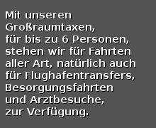 Als Taxiunternehmen führen wir mit unseren Großraumtaxen, für bis zu 6 Personen, Flughafentransfers durch. Auch wenn sie ein Taxi für Besorgungsfahrten, oder Arztbesuche brauchen, stehen wir mit unseren Taxen zur Verfügung.